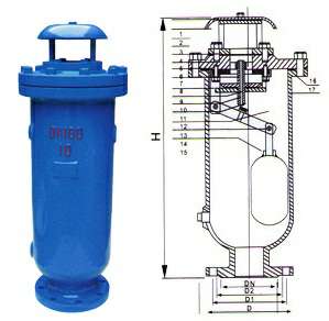 管内污水在运作时,该阀活瓣停在定位架下部,进行大量排气,当空气排完时,污水进入阀内把球浮起,传到活瓣到关闭。管内在运作时会自然产生少量气体会集中到管内上部到相当程度,阀内污水与球随时下降,气从小孔排出,如出现停电、停泵,管内水流空时随时出现负压,浮球顺水下降,打开小孔带动大孔进行大量补气确保管道。